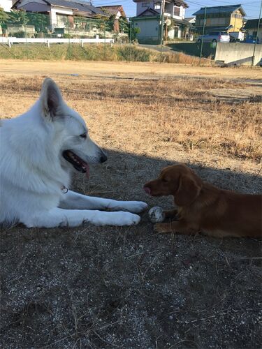 最近、毎日広場で遊んでいるからなのか、今日は何だか、ゆったりと遊んでいました。 2匹の時間。 ボールを挟んで… 何してるのか。 何をしてても、見ていてホッコリします。 いつも一緒。 2匹の時間を、満喫していました。
