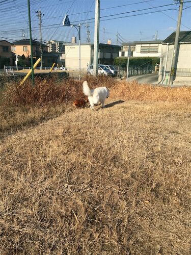 朝、歩き散歩の後は、いつもの広場へ。 まずは散策。 爆走。 2匹で、おいかけっこ。 私も仲間に入れて〜! リヤン早過ぎて、私もソルも引き離される。 ソル、小さな体で頑張ってます! 今度は、ソルが追われています。 追いかけたり、追いかけられたり。 ソ…