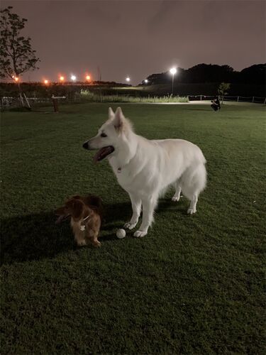 誰もいないであろう時間帯を狙って、夜のお散歩へ家族みんなで行きました。 狙い通り、誰もいない公園で、自由に遊ぶことができました! ここは、夜でも明るいので、ボールで遊んでも、ボールがちゃんと見えるので、嬉しい‼︎ ただ、夜来るには、パパと息子が…